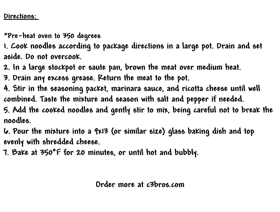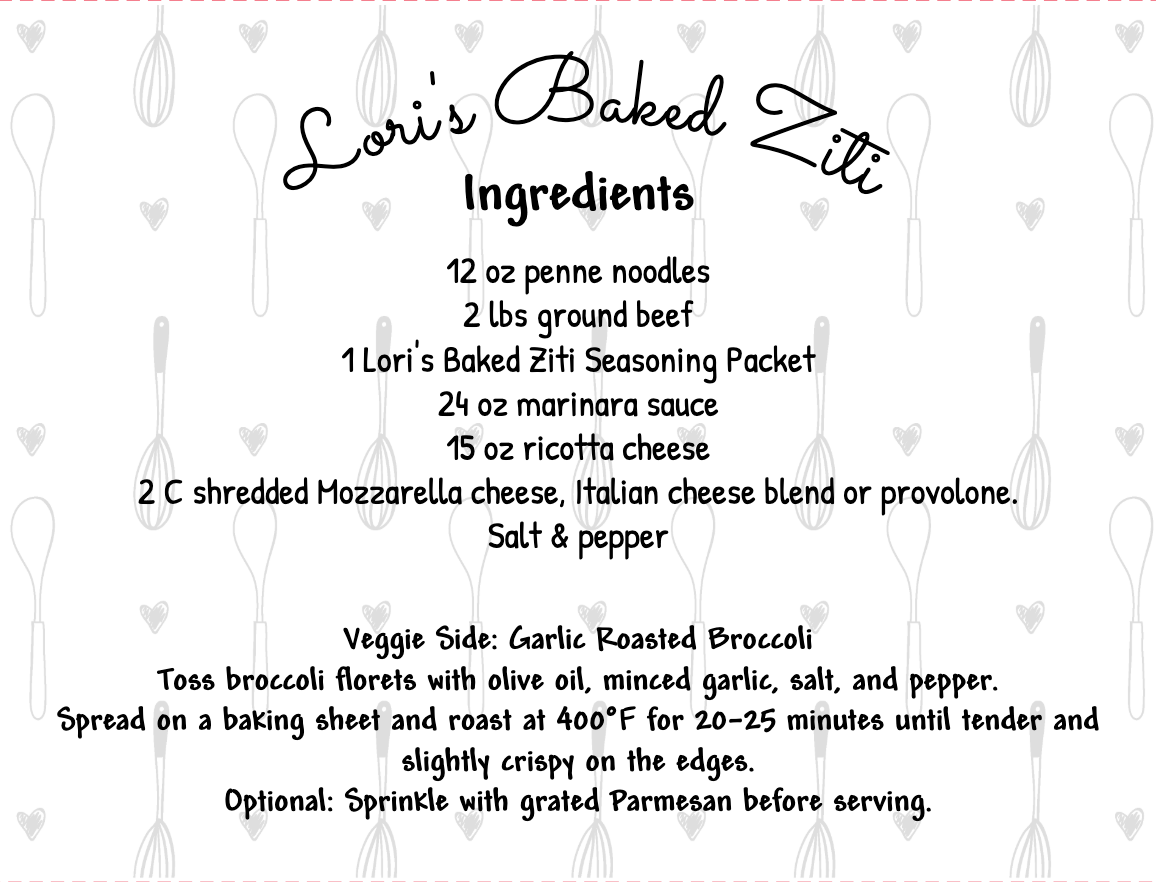 Make a hearty, family-style dinner with ease using our Baked Ziti Seasoning Packet! With just 6 simple ingredients—penne noodles, ground beef, marinara sauce, ricotta cheese, shredded mozzarella, and our signature seasoning packet—you’ll have a cheesy, flavorful meal on the table in no time.